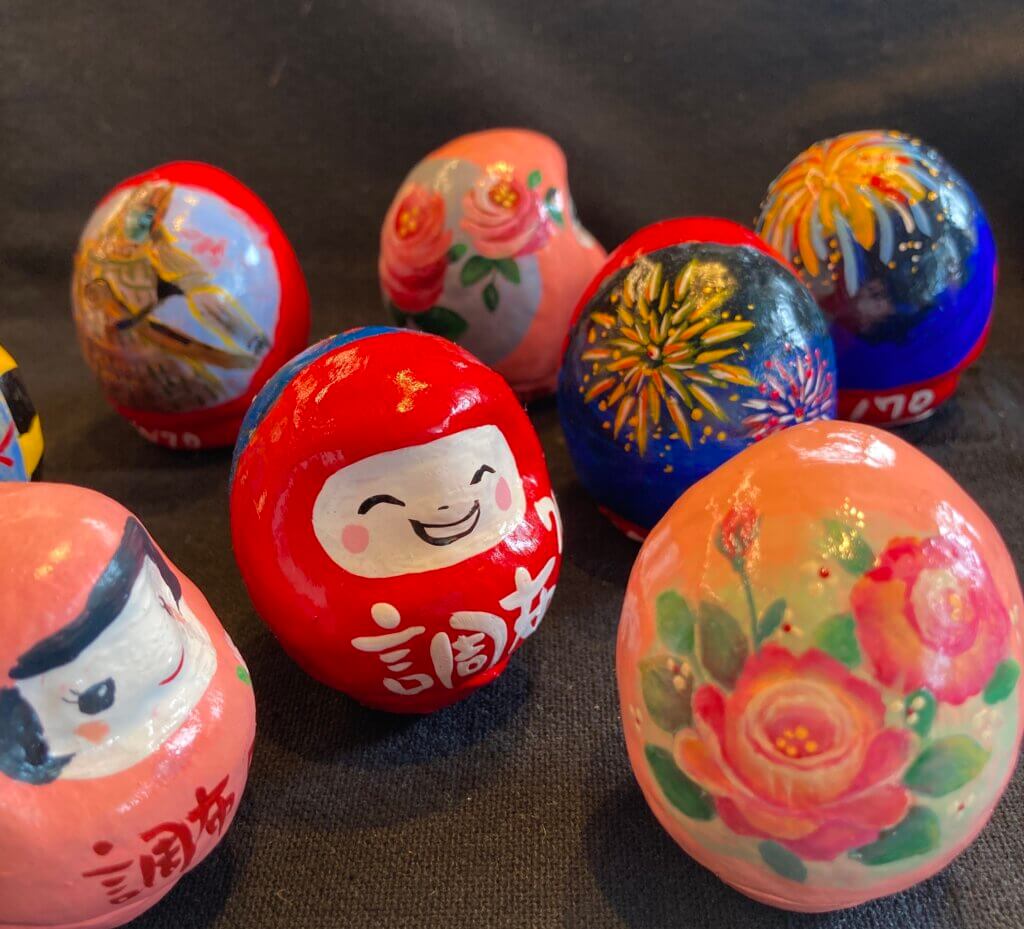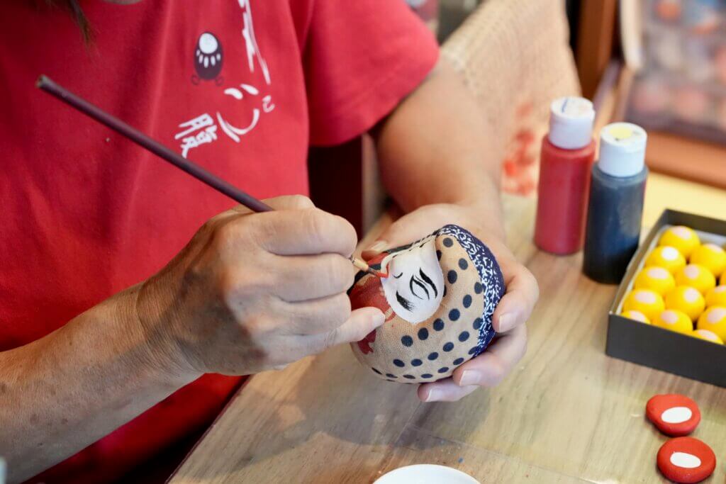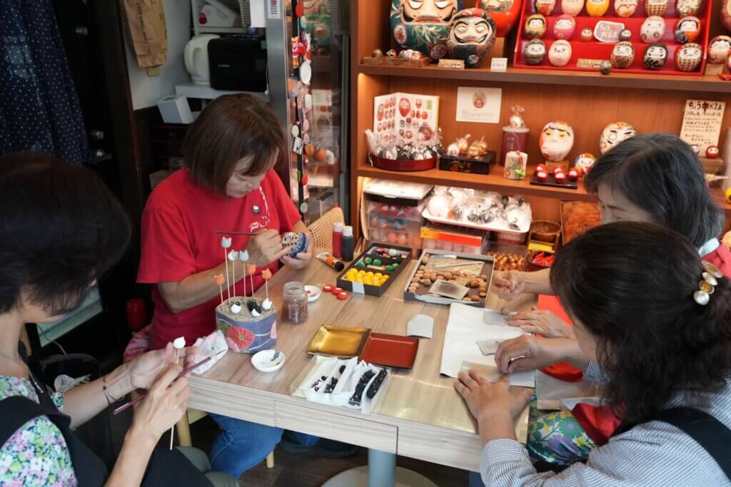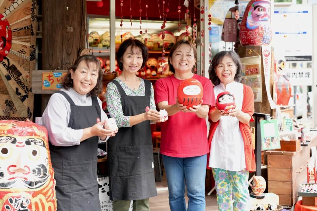 扉を開けば、全国のだるまや地域の仲間たちが手がけた一点物のだるまグッズ、「ちょう布だるま」、柿渋染めの手作り商品がずらり。店内では、だるまのゲームで遊んだり、だるまさんに変身したり、オリジナルだるまを作るワークショップ体験も楽しめます。小さいけれど、覗けば驚きと笑顔の広がる“だるまの世界”がここにあります。