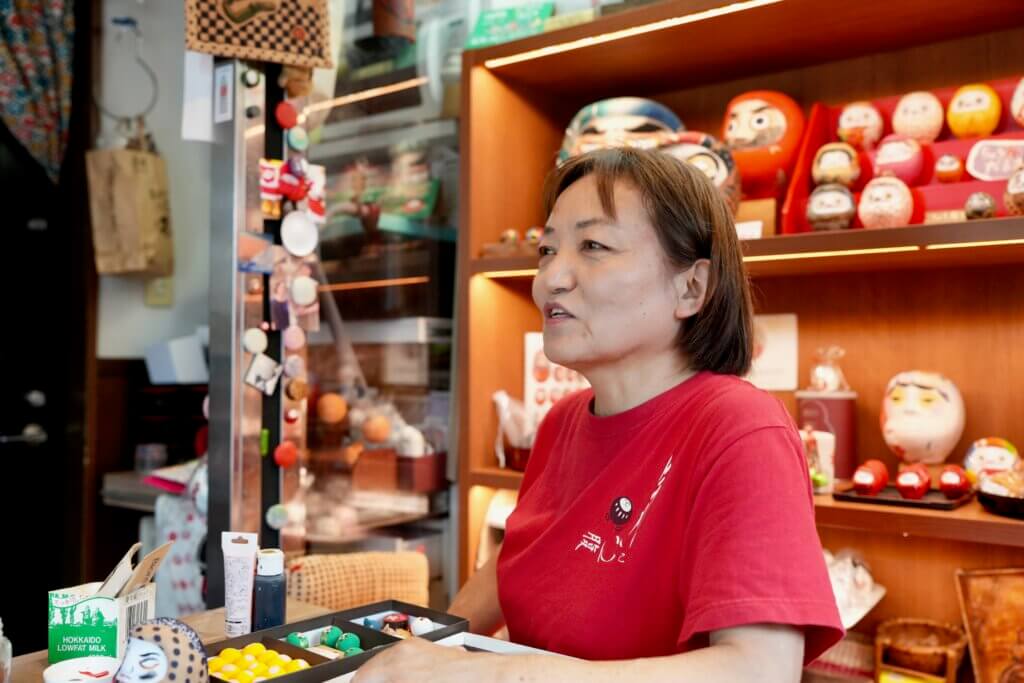 布を貼った大ぶりのだるまはアート作品のように重心がある。直径1センチの「ちいだるま」が並ぶ棚のすみでは、猫だるまに耳と縞が描き足され、別のテーブルでは粘土を成形している。お客さんがふらりと入ってきて、絵はがきやだるまを買っていく。「誰かへの贈り物」として求める人が多い。顔は自然とやわらぐ。