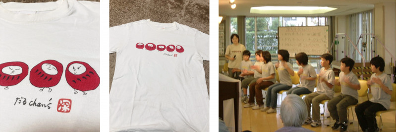 活動の中で観たボディパーカッションの舞台に感動し、ピアノの生徒たちとともに挑戦することに。地域のお祭りや、児童館祭りで披露するため、『お揃いのTシャツで出よう』と決め、練習の合間に紙と鉛筆を渡し、『深大寺といえばだるま市だよね。だるまさんを描いてみよう!』と呼びかけました。