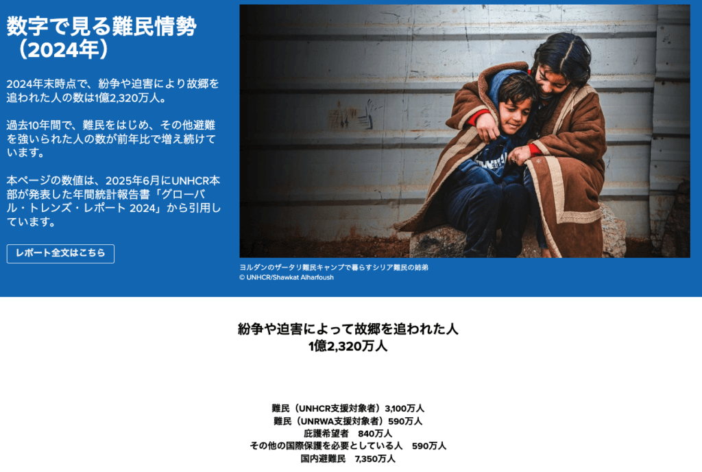 2024年末時点で、紛争や迫害で故郷を追われた人は 1億2,320万人。