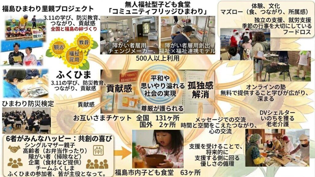 それは、ホピアスの記事でもおなじみ、福島市のNPOチームふくしま代表・半田真仁さんやスタッフのみなさん、そして市民や支援者が参加し、15年かけて築いてきた新しい取り組み、「恩送り」「お互いさまのまち」という活動です。その活動は、共生と福祉を起点に、人とまちをつなぎ、循環させる仕組みです。
